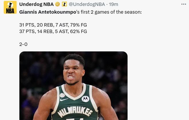 這也是字母哥開季以來火爆狀態的延續,首秀字母哥就以62%的命中率拿下37分14籃板5助攻。